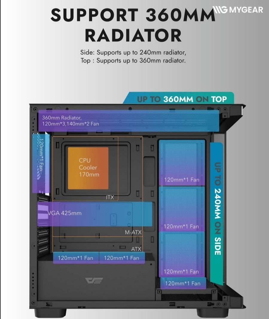 Với vỏ case máy tính DarkFlash DS900G, bạn hoàn toàn có thể lắp đặt card đồ họa cao cấp thế hệ RTX 50 series như RTX 5060 đến RTX 5090. Đồng thời, sản phẩm cũng hỗ trợ các giải pháp tản nhiệt nước custom hoặc AIO, phù hợp cho những ai cần hiệu năng mạnh mẽ và độ ổn định cao.