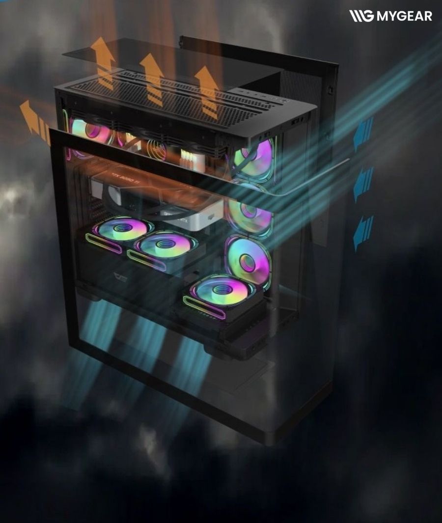 Case DarkFlash DS900G ATX được thiết kế với airflow tối ưu, cho khả năng hút gió và tản nhiệt vượt trội. Người dùng có thể lắp nhiều quạt làm mát hoặc radiator (240mm – 360mm) để giữ nhiệt độ hệ thống luôn ổn định, ngay cả khi chạy ứng dụng nặng hoặc chơi game trong nhiều giờ.