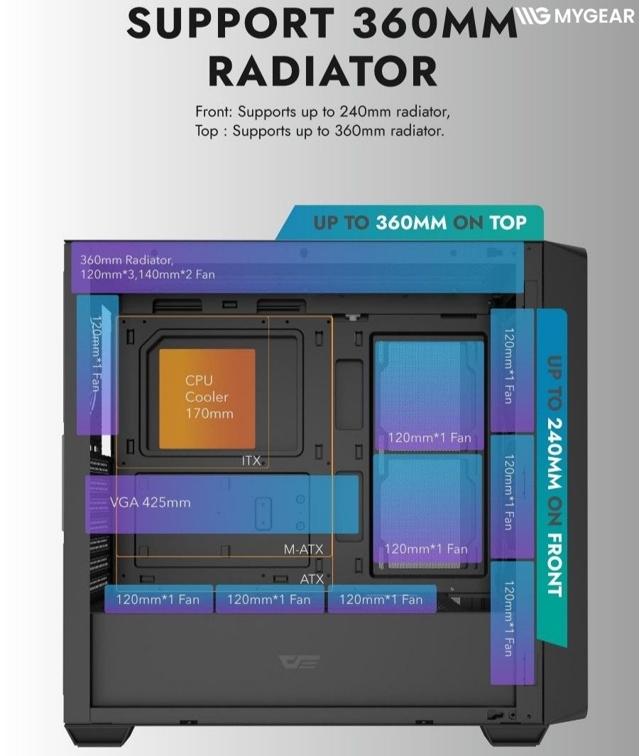 Điểm nổi bật nhất của vỏ case DarkFlash DS900WD chính là khả năng tản nhiệt. Thiết kế dạng mesh thông minh giúp lưu thông khí tốt hơn, hỗ trợ lắp đặt nhiều quạt tản nhiệt hoặc radiator 360mm cho AIO hay Custom water cooling. Điều này giúp giữ hệ thống luôn mát mẻ kể cả khi hoạt động với cường độ cao.
