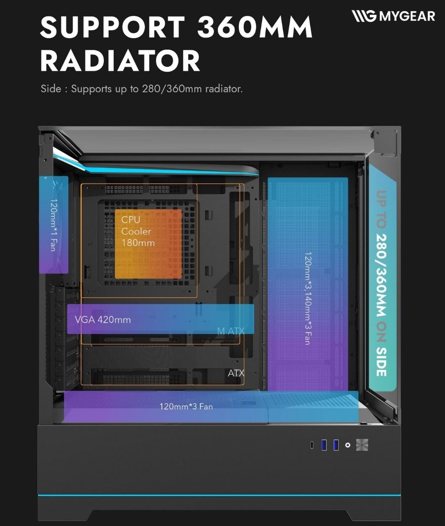 | Hỗ trợ quạt | Side: 3×120mm/3×140mm, Rear: 1×120mm/1×140mm, Bottom: 3×120mm |