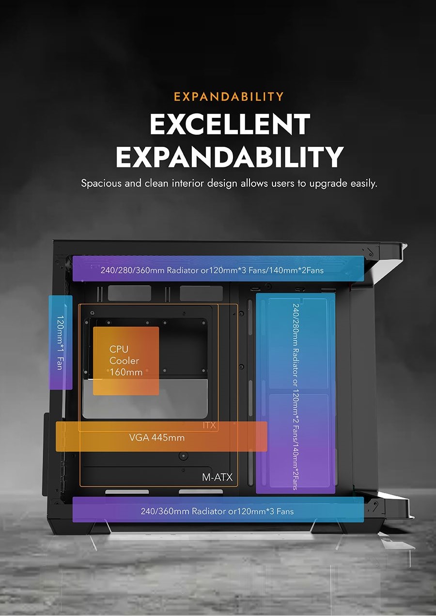 Kích thước tổng thể nhỏ nhưng không ảnh hưởng đến khả năng nâng cấp, cho phép người dùng lắp card đồ họa dài, PSU chuẩn ATX và hệ thống tản nhiệt đa dạng. Vỏ case M-ATX nhỏ gọn là sự cân bằng tuyệt vời giữa kích thước tối ưu và hiệu năng linh kiện.