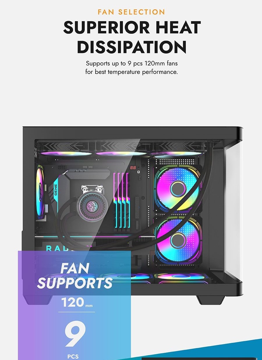 Vỏ case DarkFlash L285M được thiết kế tối ưu luồng gió với khả năng lắp với 3 quạt 120mm mặt bên, 1 quạt 120mm phía sau, 3 quạt 120mm ở mặt dưới và 3 quạt 120mm ở nắp trên. Luồng khí vào từ trước và thoát ra phía sau/đỉnh, giúp giữ nhiệt độ hệ thống luôn ổn định. Nếu bạn muốn dàn máy hoạt động yên tĩnh và mát mẻ, đây là một lựa chọn không thể bỏ qua.