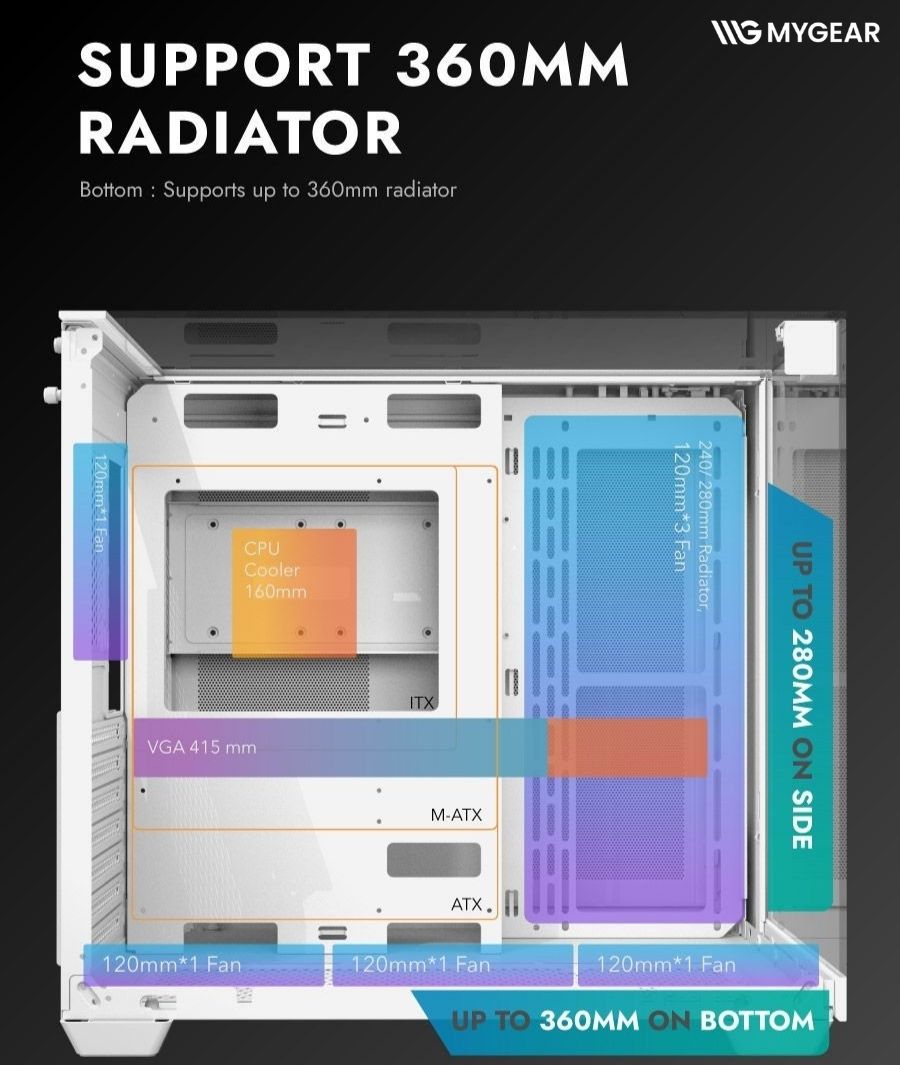 | Hỗ trợ radiator | Side: 240/280 mm, Bottom: 240/360 mm |