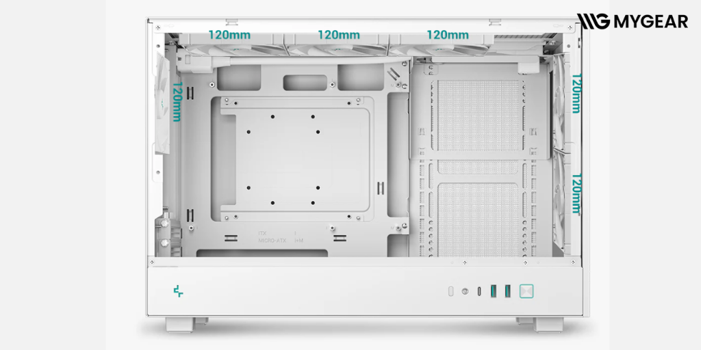 Vỏ case DeepCool CH260 White có thể lắp tối đa 6 quạt làm mát, đồng thời hỗ trợ radiator tản nhiệt nước 360mm. Điều này đảm bảo hệ thống của bạn luôn vận hành ổn định, nhiệt độ được duy trì ở mức tối ưu khi chơi game nặng hoặc render đồ họa.