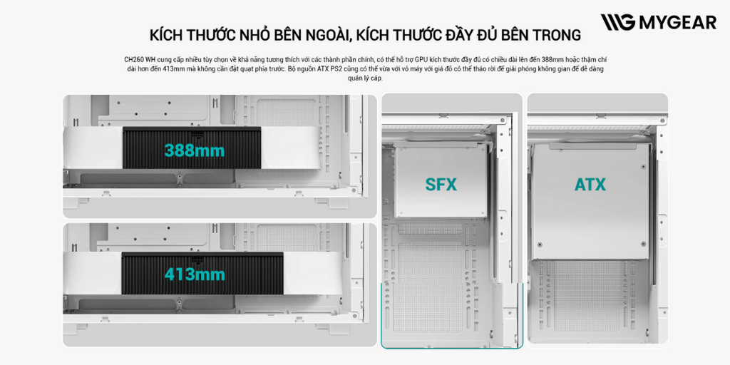 | Chiều dài GPU tối đa | 388/413mm (Không lắp quạt trước) |