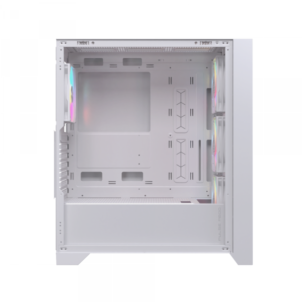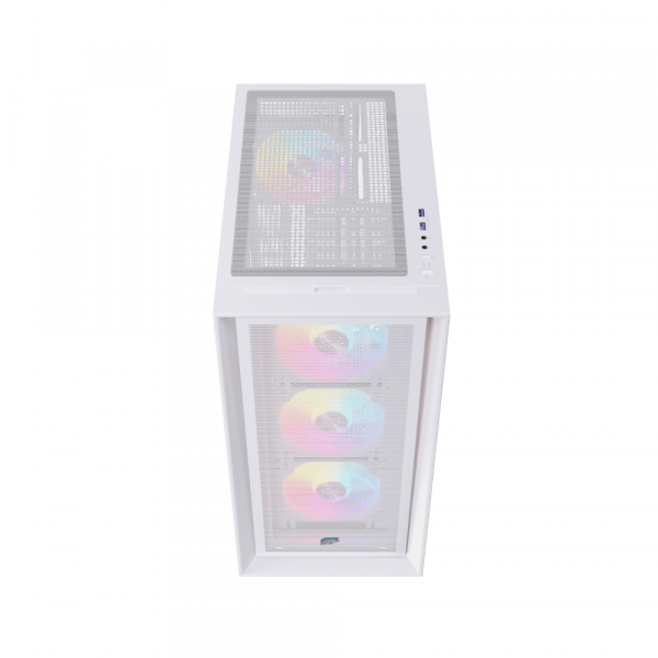 Case P600 RGB trắng sở hữu hệ thống quạt tích hợp gồm 3 quạt ARGB phía trước và 1 quạt ARGB phía sau, hỗ trợ lắp thêm quạt phía trên 2 × 120 / 140 mm, đáy 2 × 120 mm, sau 1 × 120 / 140 mm. Hỗ trợ radiator phía trước 360mm, trên 240mm, sau 120mm, giúp build PC luôn mát mẻ, ổn định hiệu năng khi chơi game hoặc render. Cổng I/O gồm 2 × USB 3.0, 1 × USB 2.0, 1 × jack audio/mic 3.5 mm, thuận tiện kết nối với tai nghe gaming, USB lưu trữ hoặc ổ cứng di động mà không cần mở case.