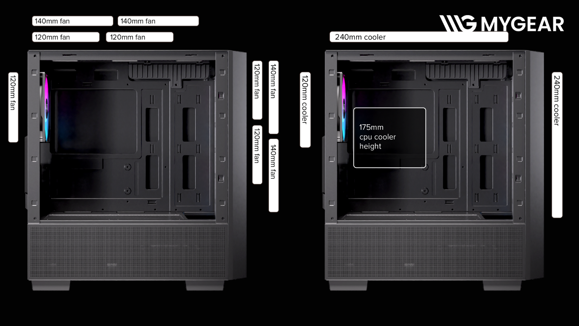 | Hỗ trợ quạt | Front: 3×120mm hoặc 2×140mm (2 quạt 140mm ARGB sẵn); Top: 2×120/140mm; Rear: 1×120mm (1 quạt ARGB sẵn) |