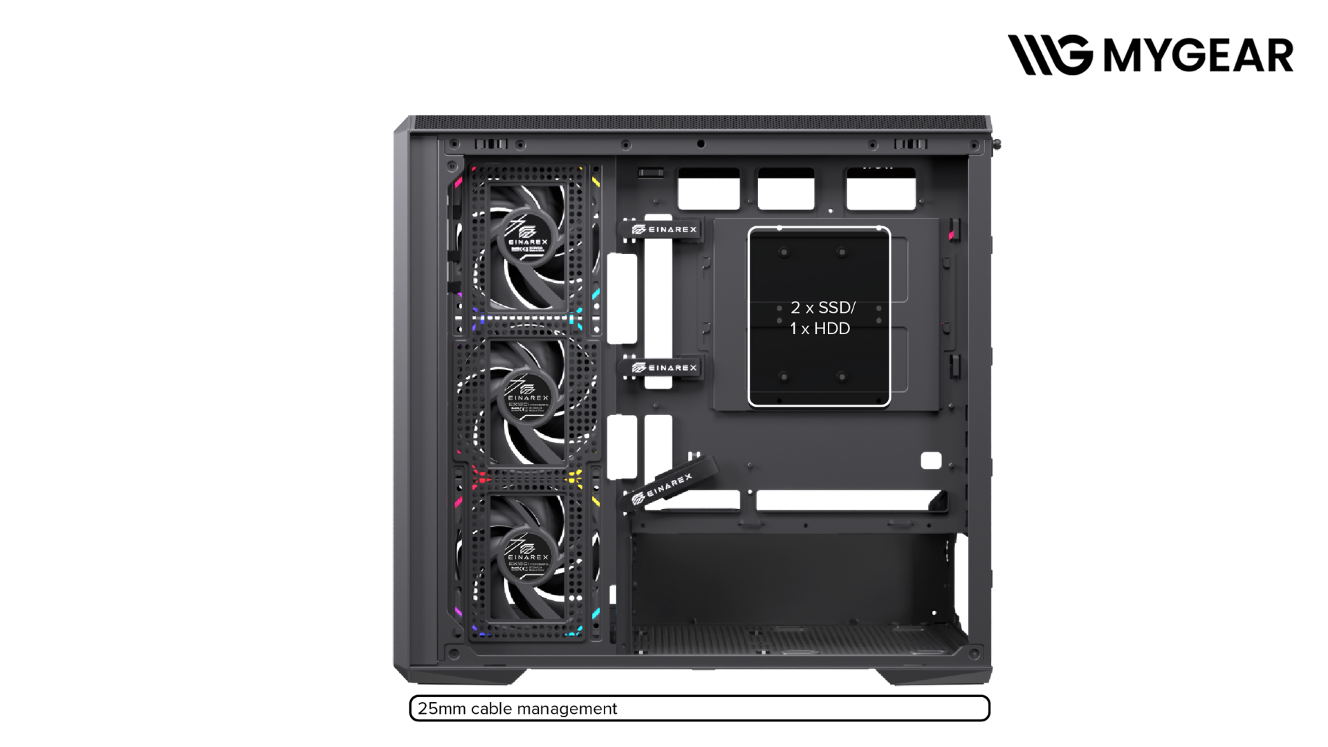 Case gaming mATX Einarex ZM800 RGB với 1 khay SSD/HDD 2.5/3.5 inch, case cung cấp không gian lưu trữ cơ bản, phù hợp với nhu cầu chơi game, làm việc văn phòng hoặc build PC đồng bộ RGB. Khoang lưu trữ được bố trí hợp lý, dễ đi dây và tối ưu luồng khí.