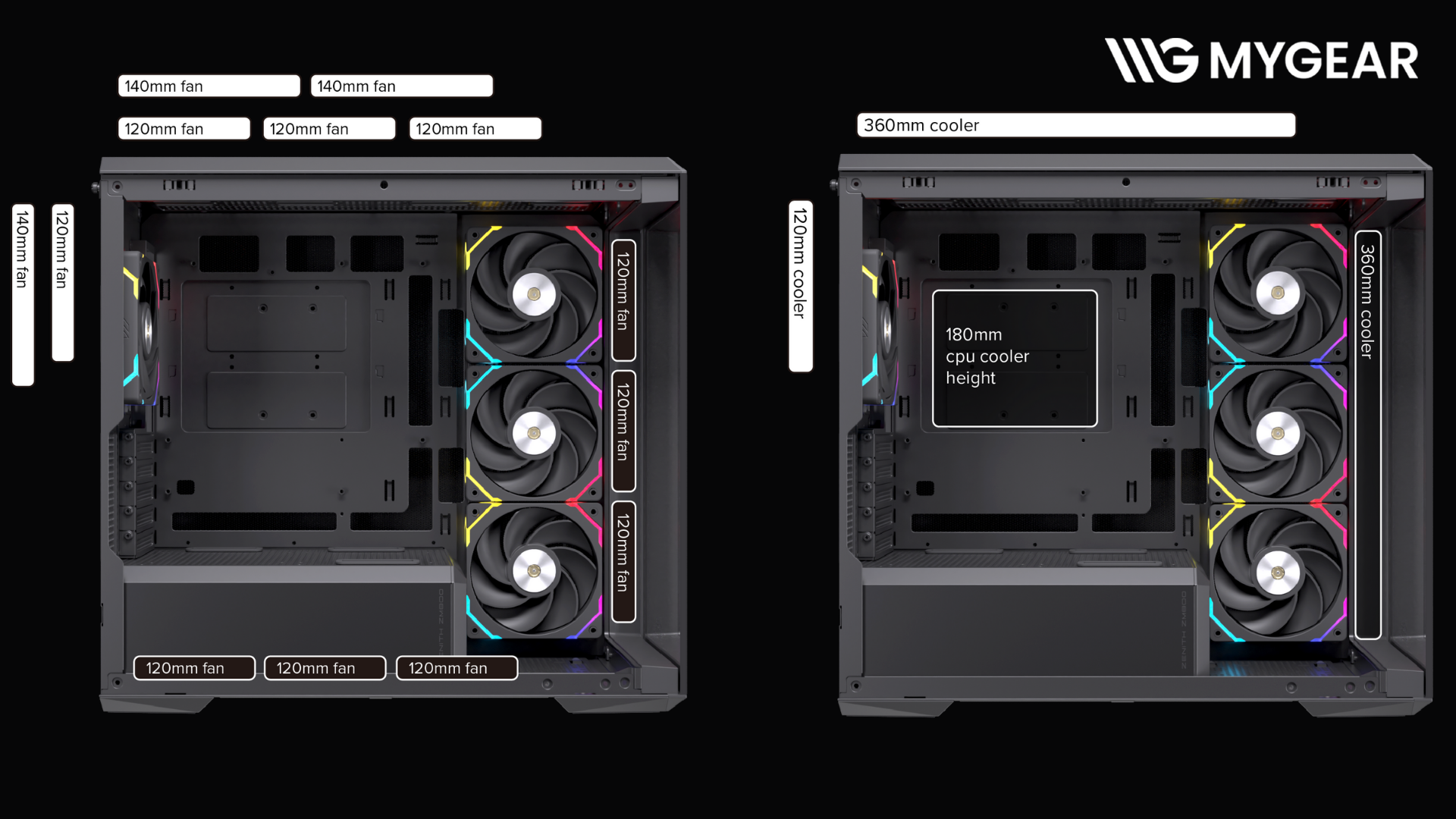 | Hỗ trợ quạt | Top: 3×120mm / 2×140mm; Bottom: 3×120mm; Side: 3×120mm; Rear: 1×120/140mm |