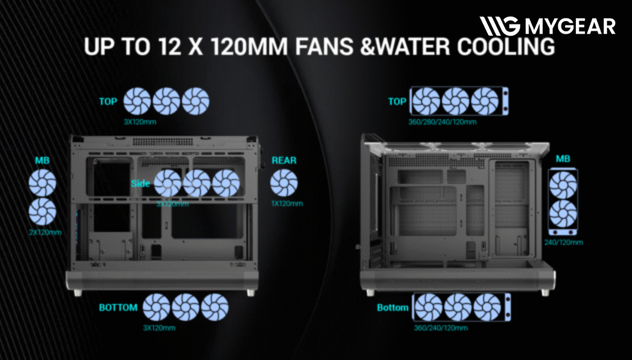 | Hệ thống Fan hỗ trợ | Top: 3x120mm, Bottom: 3x120mm, Side: 3x120mm, Rear: 1x120mm, MB: 2x120mm |