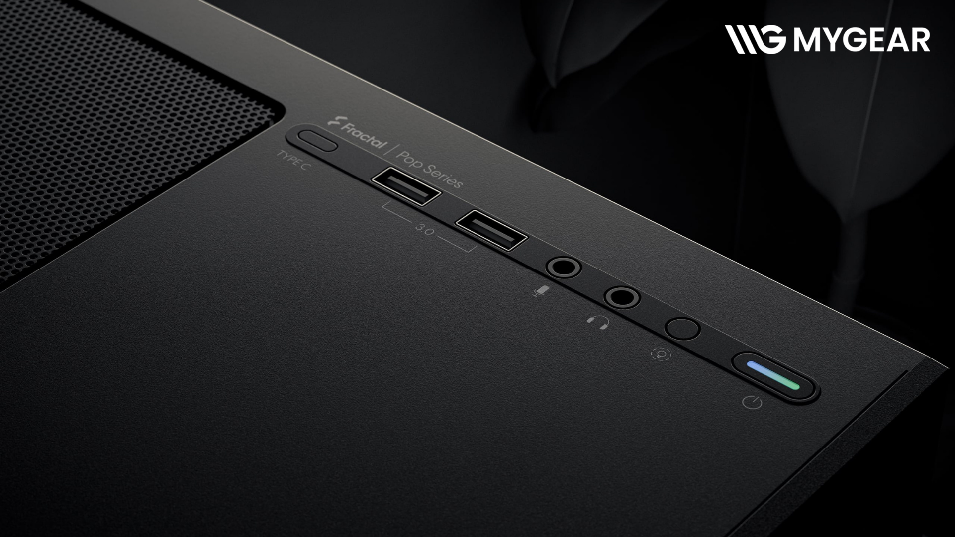 Cụm I/O của Fractal Design Pop Mini Air RGB White gồm 2 cổng USB 3.0, cổng Audio và nút điều khiển RGB. Case cũng hỗ trợ nâng cấp USB-C thông qua phụ kiện rời, giúp tăng khả năng sử dụng lâu dài.