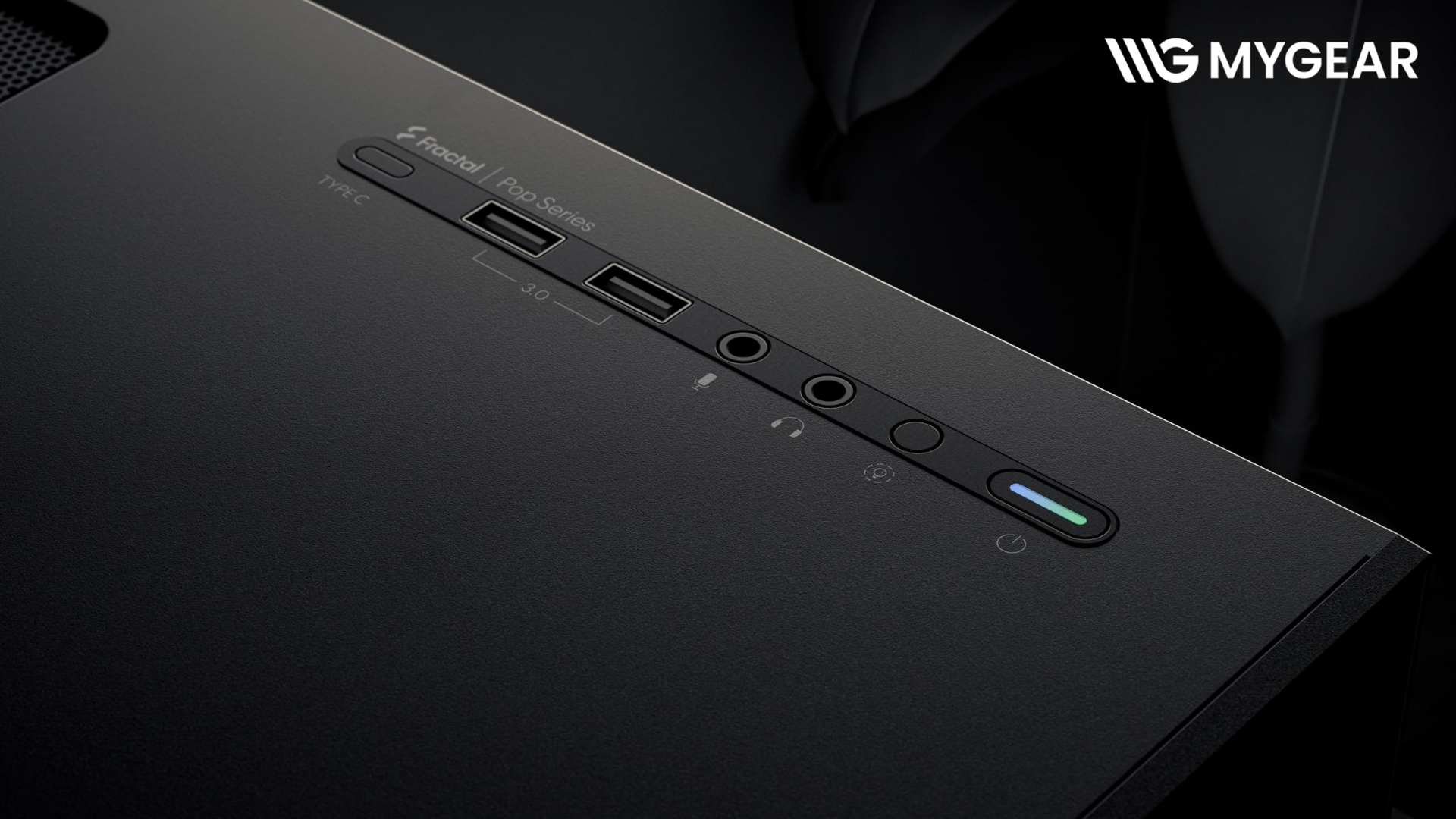 Cụm I/O của vỏ case Fractal Design Pop XL Air RGB Black gồm 2 cổng USB 3.0, Audio và nút điều khiển RGB. Case có sẵn vị trí chờ nâng cấp cổng USB-C thông qua phụ kiện rời, phù hợp cho nhu cầu sử dụng lâu dài.