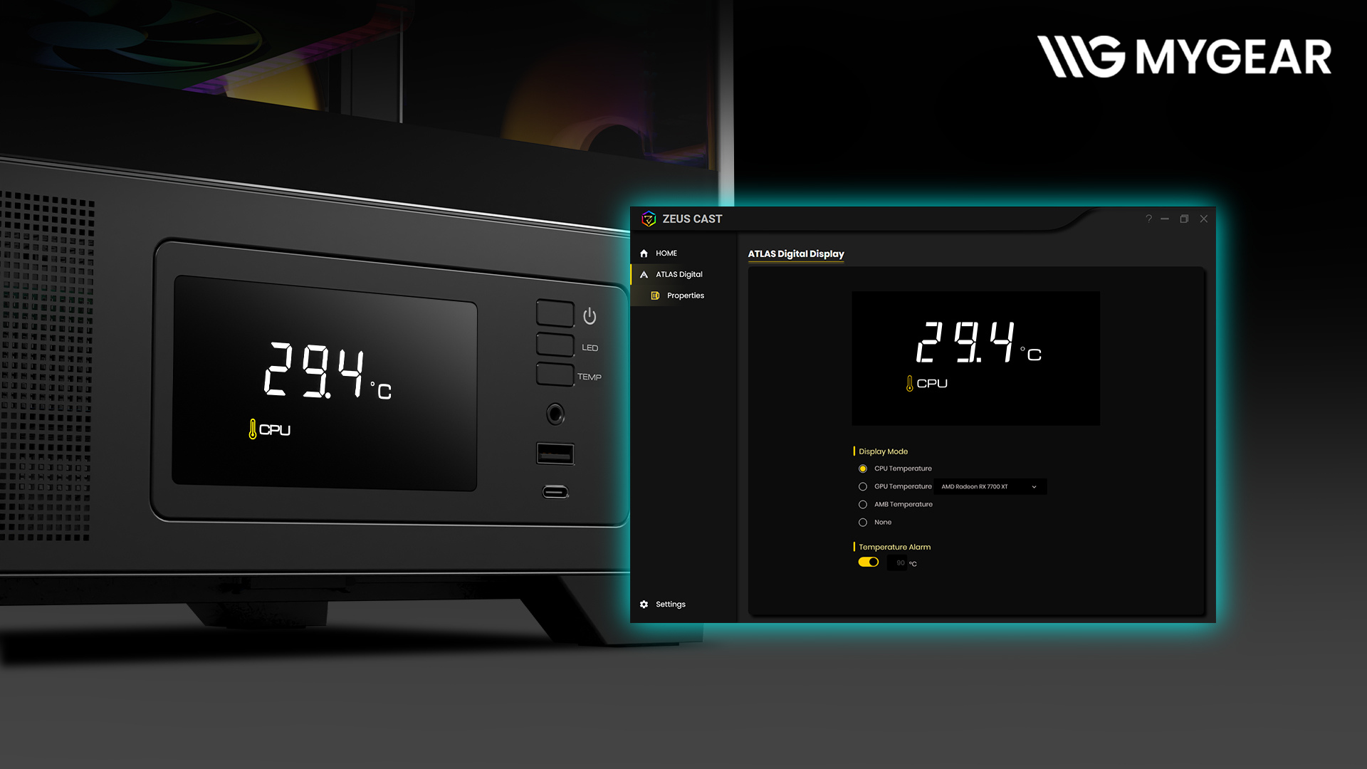 Một trong những điểm sáng của case tích hợp màn hình LCD ATLAS P2 CG là màn hình hiển thị nhiệt độ CPU, GPU và môi trường ngay trên thân case. Tính năng hiển thị cho phép người dùng theo dõi tình trạng hoạt động của hệ thống mà không cần mở phần mềm, đặc biệt hữu ích khi ép xung hoặc chơi game trong thời gian dài.