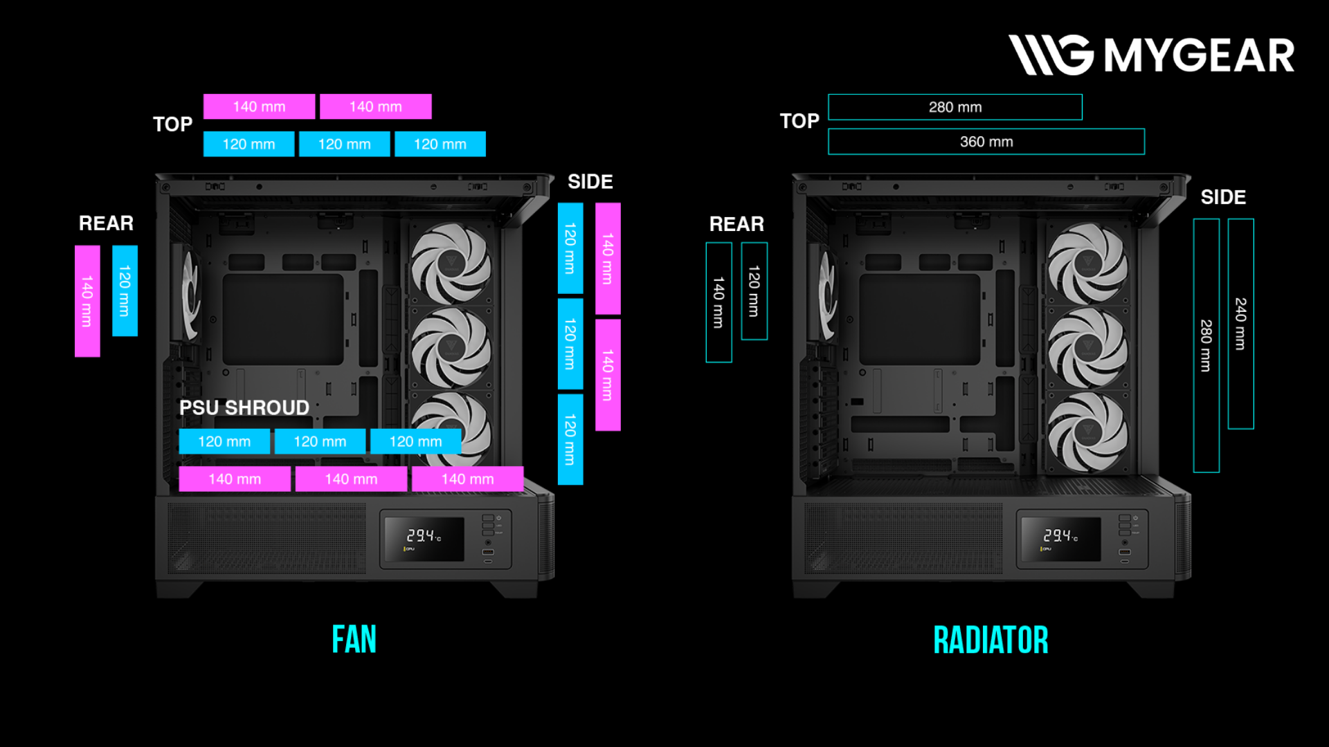 | Hỗ trợ tản nhiệt nước | Trên: 360mm/280mm; Hông: 280mm/240mm; Sau: 140mm/120mm |
