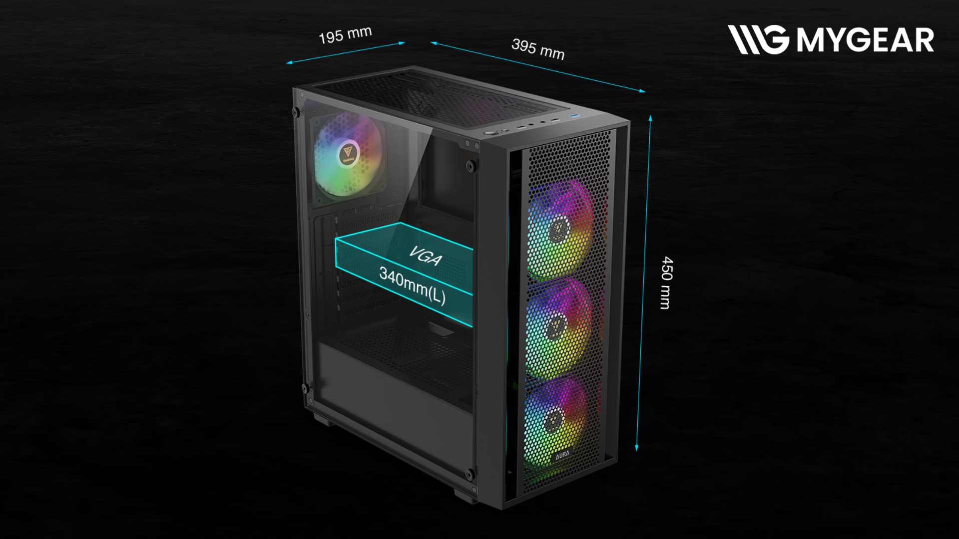 Cửa sổ kính cường lực bên trái giúp vỏ case mid tower RGB khoe trọn linh kiện và hệ thống quạt RGB bên trong một cách rõ ràng, phù hợp với các góc gaming phong cách hiện đại. Kích thước tổng thể 395 × 195 × 450 mm giúp case Gamdias AURA GC2 Black có form dáng gọn gàng, dễ đặt trên bàn hoặc dưới gầm bàn làm việc.
