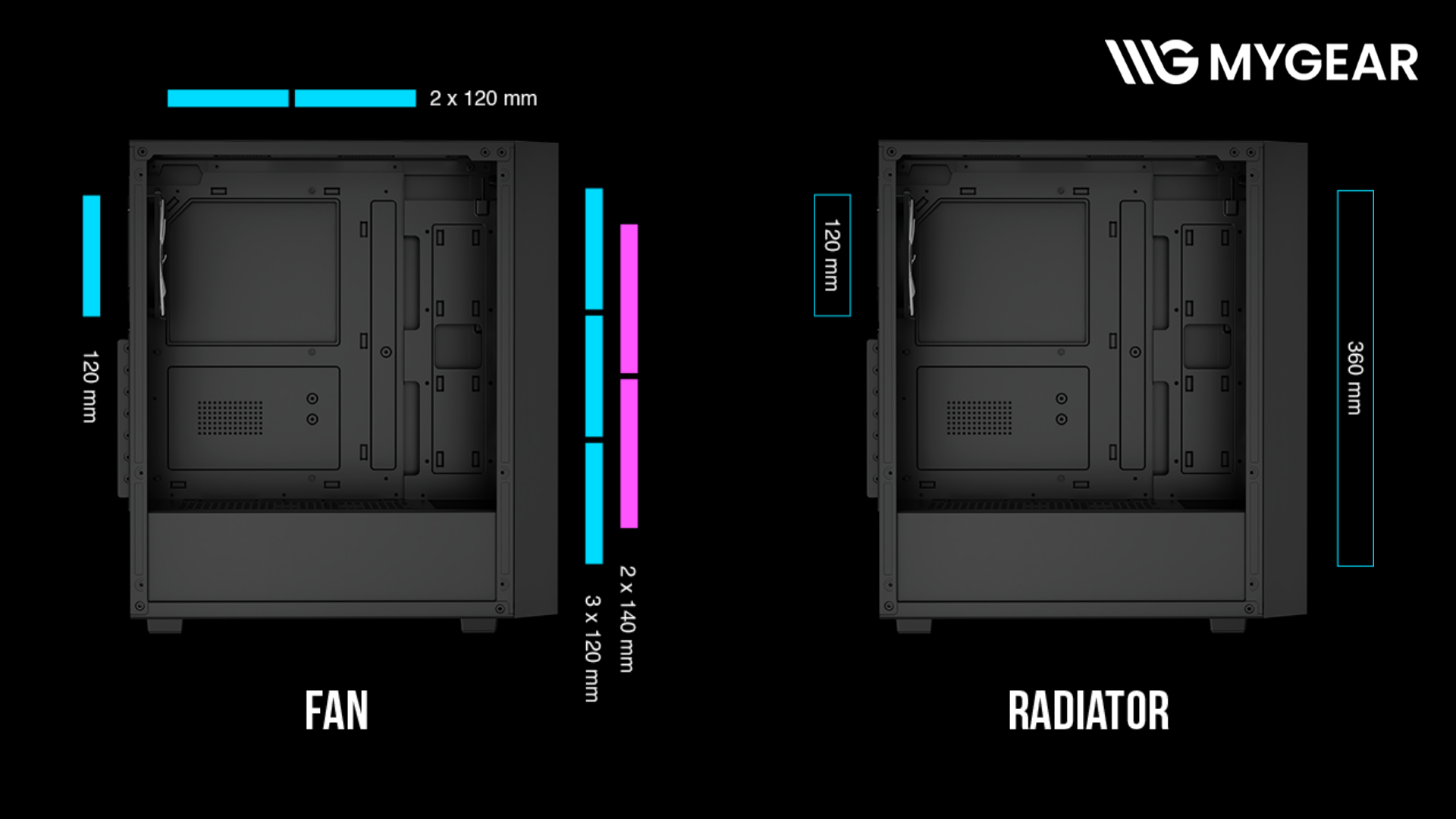 Vỏ case Gamdias AURA GC2 ELITE BK hỗ trợ radiator 360mm ở mặt trước và radiator 120mm ở mặt sau, đủ đáp ứng nhu cầu lắp tản nhiệt nước AIO phổ thông. Nhờ đó, vỏ case mid tower RGB cho phép người dùng nâng cấp hệ thống làm mát khi cần mà không gặp nhiều hạn chế về không gian.