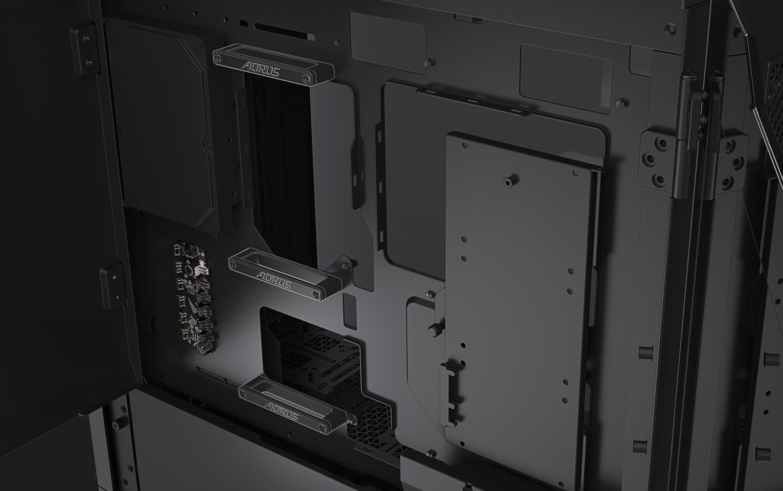 Phía sau tray mainboard của vỏ case GIGABYTE AORUS AC601 được thiết kế nhiều rãnh đi dây, kèm theo đó là không gian rộng rãi cho phép giấu toàn bộ dây dẫn. Nhờ đó, bạn dễ dàng setup một hệ thống PC với cable management gọn gàng, thẩm mỹ.