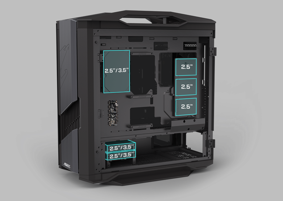 Case GIGABYTE AORUS AC601 GLASS hỗ trợ tới 4 khe ổ cứng 3.5 inch và 3 khe 2.5 inch SSD, cho phép người dùng thoải mái mở rộng dung lượng lưu trữ theo nhu cầu gaming hoặc làm việc.