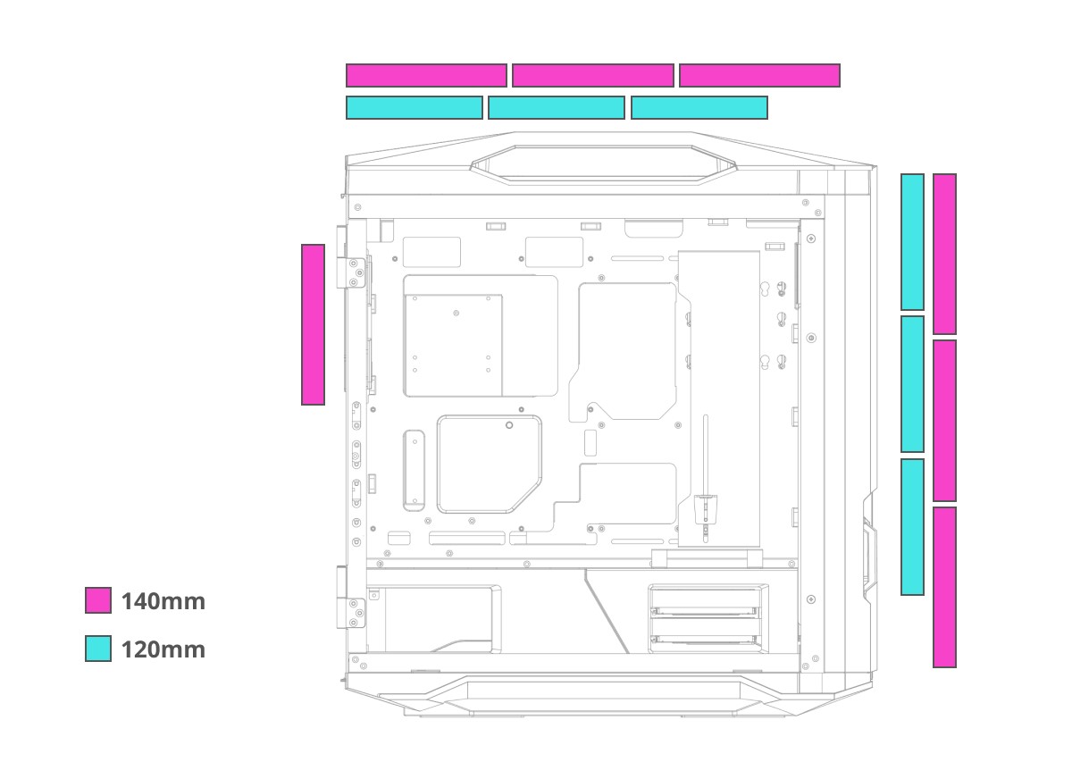| Hỗ trợ fan | Mặt trước: 120mm x3/140mm x3 Mặt trên: 120mm x3/140mm x3 Mặt sau: 140mm x1 |