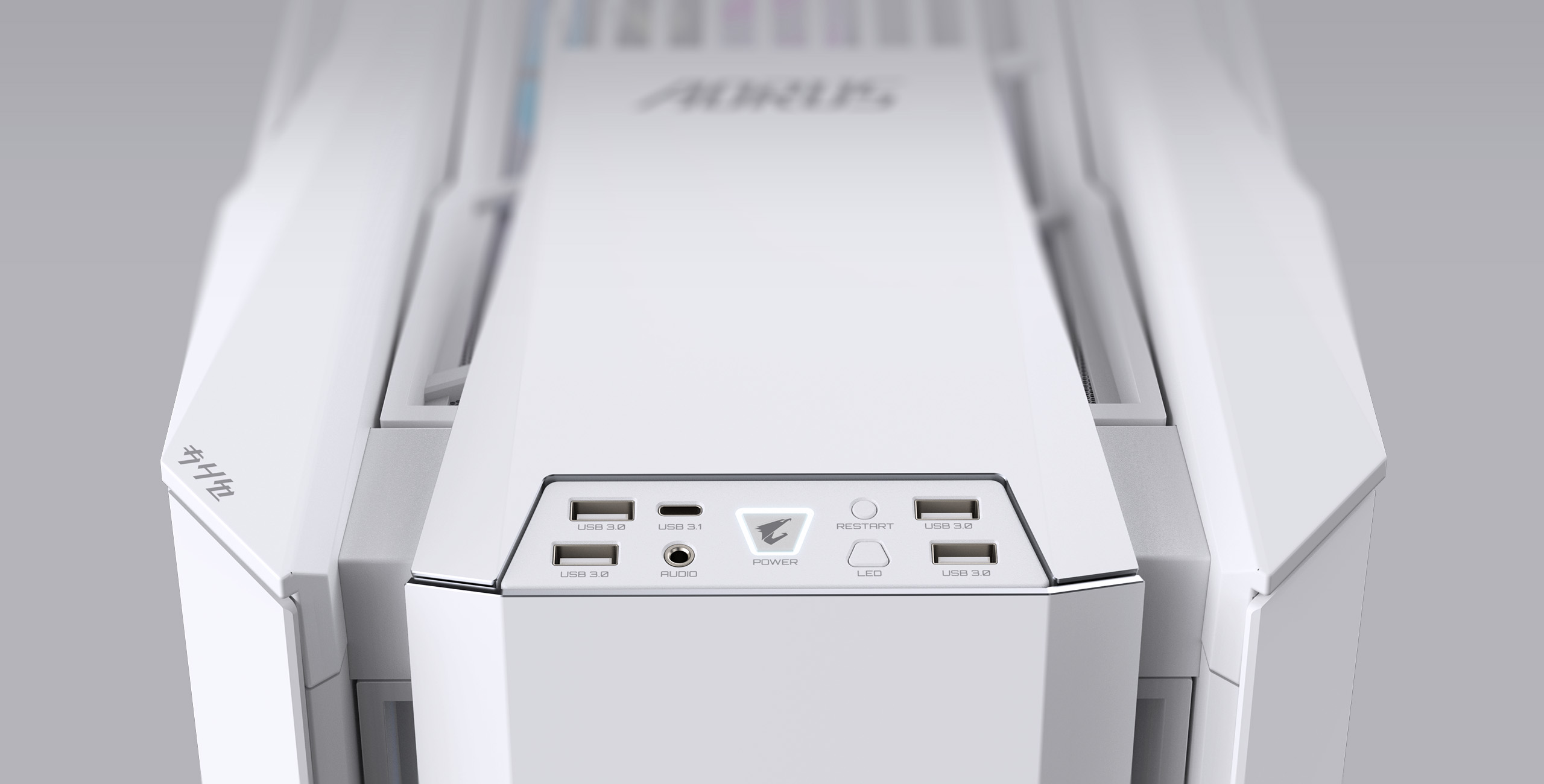 Mặt trước case gaming mid tower GIGABYTE AORUS AC601 được trang bị 4 cổng USB 3.0, 1 cổng USB 3.1 Gen1 Type-C, cùng jack Audio/Mic 3.5mm, thuận tiện cho việc kết nối tai nghe, USB hoặc các thiết bị ngoại vi.