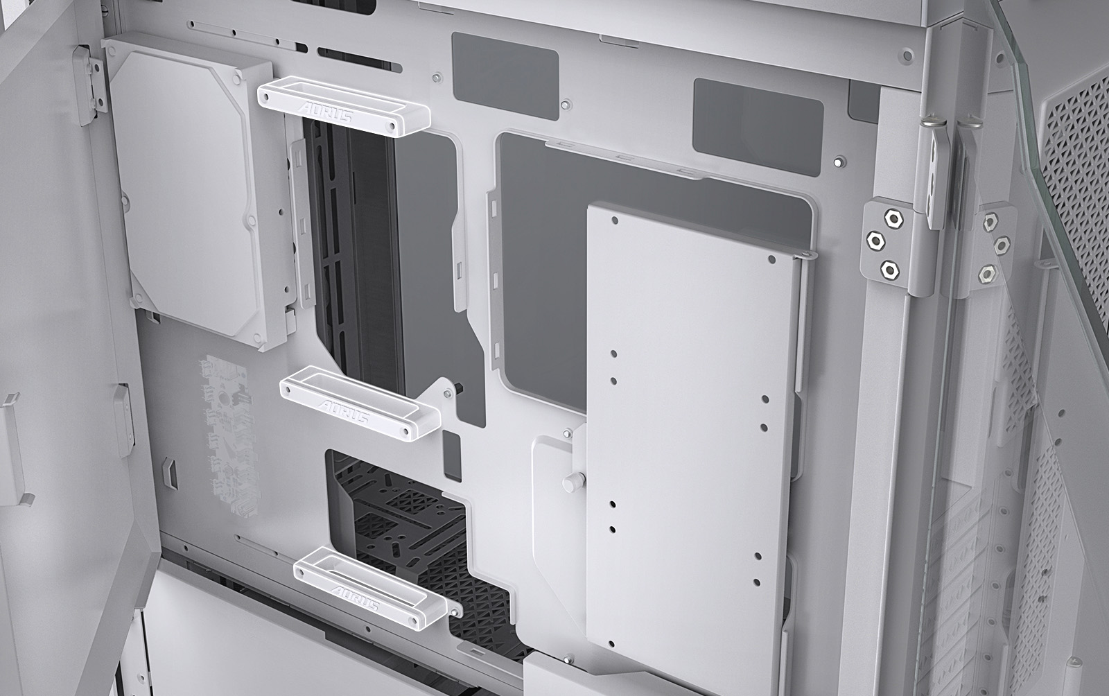 Vỏ GIGABYTE AORUS AC601 GLASS ICE với khoang chứa dây phía sau mainboard tray rộng rãi, đi kèm nhiều rãnh đi dây logic, giúp bạn dễ dàng thực hiện cable management gọn gàng. Giúp tổng thể build máy luôn ngăn nắp, thẩm mỹ dù bạn sử dụng nhiều fan hay RGB hub.