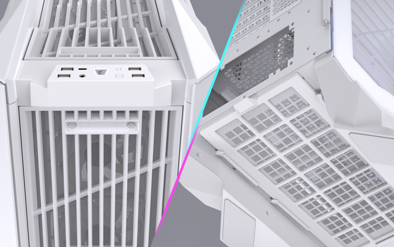 Vỏ case GIGABYTE AORUS AC601 GLASS ICE tích hợp tấm lọc bụi ở phía trước, phía trên và dưới, dễ dàng tháo lắp và vệ sinh, giúp linh kiện luôn sạch sẽ, kéo dài tuổi thọ hệ thống.