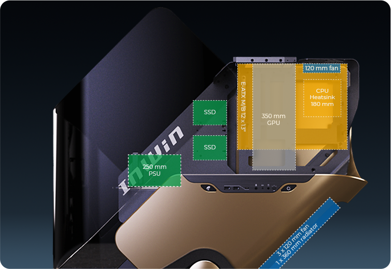 InWin Infinite được thiết kế với kích thước full tower cực lớn, hỗ trợ đầy đủ các chuẩn mainboard từ Mini-ITX, Micro-ATX, ATX, đến E-ATX. Không gian nội thất cực kỳ thoáng đãng giúp người dùng dễ dàng lắp card đồ họa dài đến 370mm, tản nhiệt khí cao tới 180mm và PSU dài 250mm.