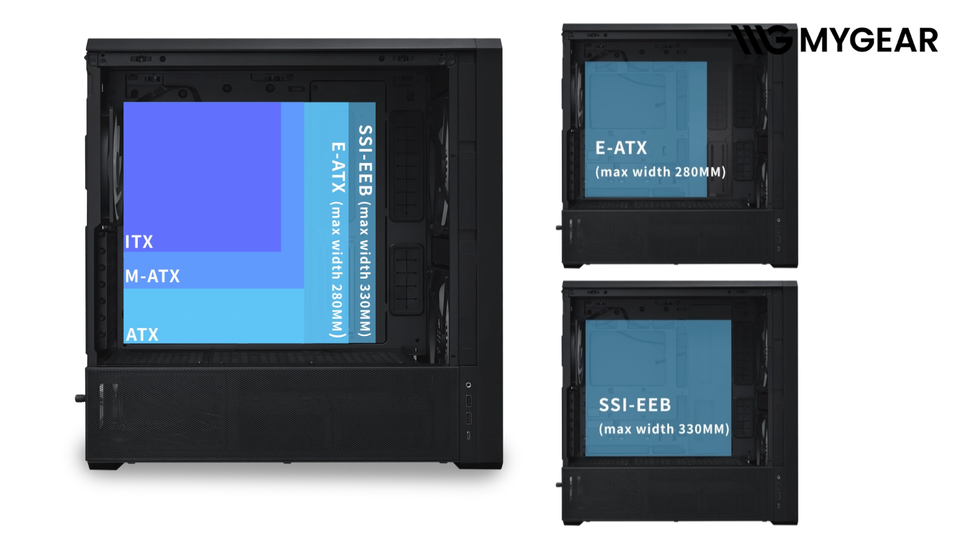 | Hỗ trợ mainboard | EEB (≤330mm) / E-ATX (≤280mm) / ATX / Micro-ATX / Mini-ITX / Back-connect ATX, M-ATX |