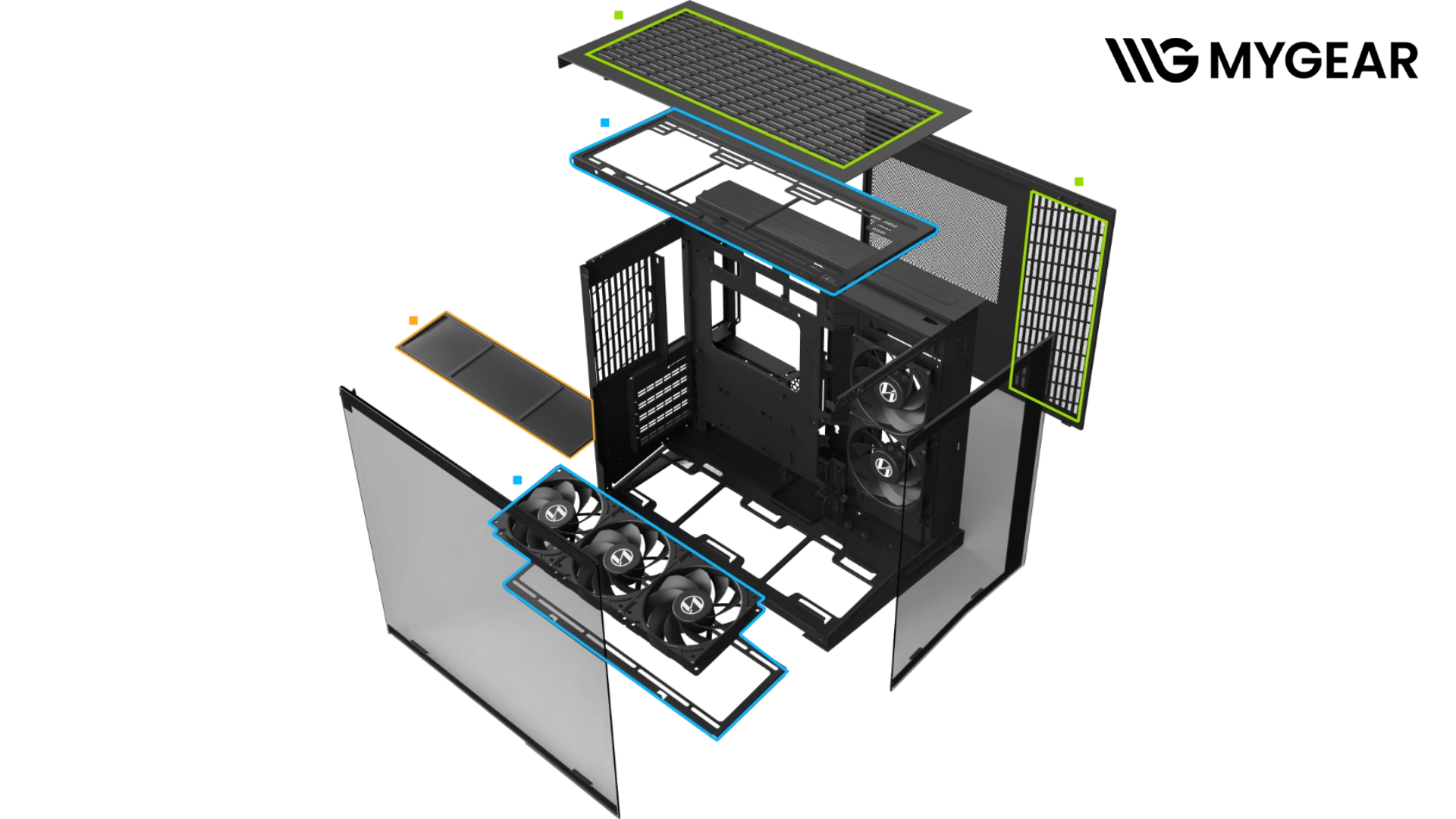 MYGEAR cung cấp đầy đủ linh kiện đi kèm quạt PWM, tản nhiệt nước, card màn hình, RAM RGB, PSU, giúp bạn dễ dàng build một hệ thống O11D Mini V2 Flow đồng bộ, vừa đẹp vừa hiệu quả.