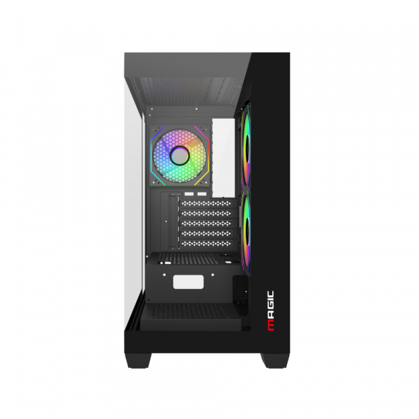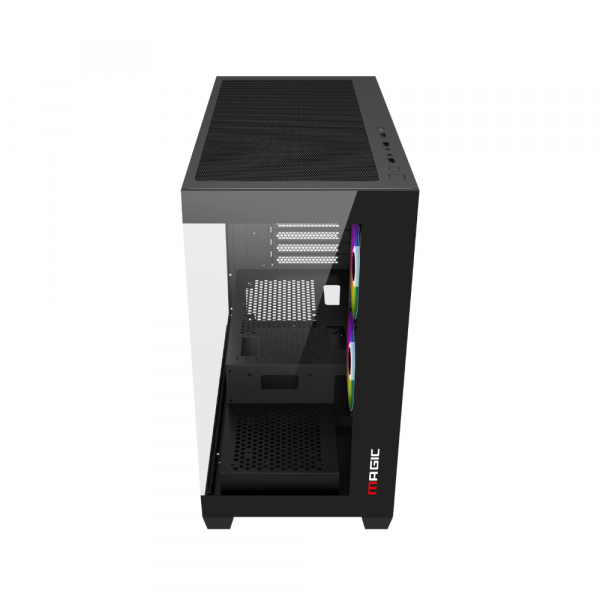 Để đáp ứng nhu cầu thẩm mỹ ngày càng cao của game thủ, MAGIC C218-M được trang bị mặt hông bằng kính cường lực trong suốt. Nhờ đó, bạn có thể khoe trọn vẹn nội thất bên trong dàn PC, từ quạt RGB rực rỡ đến card màn hình cao cấp. Kính được gia công chắc chắn, độ trong cao, vừa bền bỉ vừa mang lại vẻ đẹp sang trọng cho hệ thống. Đây là điểm cộng lớn với những ai yêu thích build PC theo phong cách trưng bày.