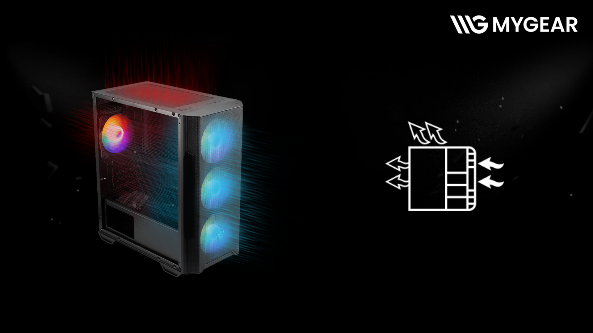 Một điểm mạnh nổi bật của MSI M100A là được trang bị sẵn 3 quạt 120mm Auto-RGB phía trước và 1 quạt 120mm Auto-RGB phía sau. Hệ thống quạt lắp sẵn giúp tăng cường luồng gió làm mát ngay từ khi lắp ráp mà không cần đầu tư thêm quạt rời. RGB tự động tạo hiệu ứng ánh sáng nổi bật, phù hợp với các build PC gaming hiện đại.