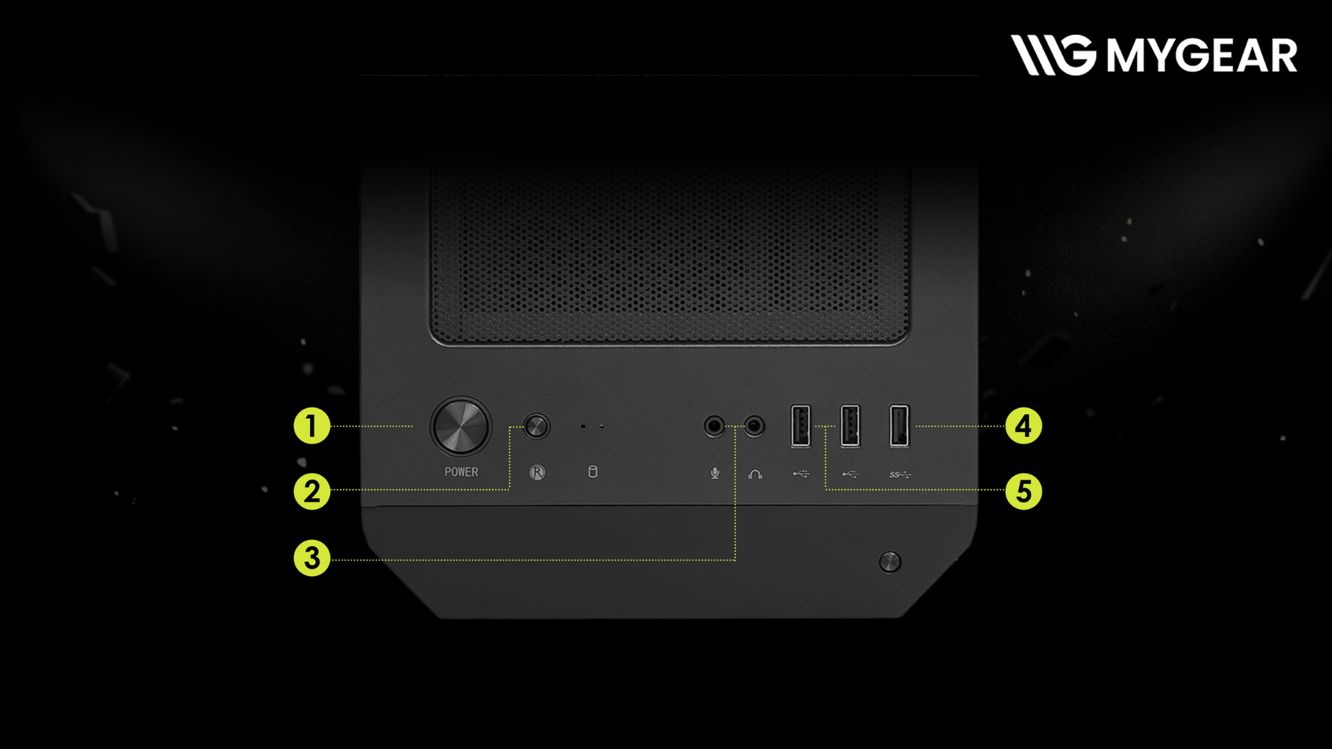 Mặt I/O phía trước của MSI M100A bao gồm 1 cổng USB 3.2 Gen 1 Type-A, 2 cổng USB 2.0 Type-A, cổng Audio, cổng Mic, nút Reset và nút Nguồn. Bố trí phía trước giúp kết nối thiết bị ngoại vi nhanh chóng như USB, tai nghe hoặc bàn phím cơ mà không cần thao tác phía sau máy.