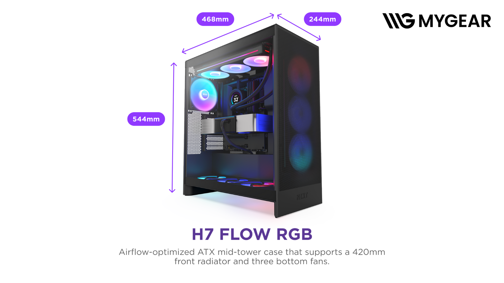Với mặt trước dạng lưới lớn, vỏ case airflow NZXT H7 Flow tối ưu luồng khí, đưa không khí mát vào hệ thống và đẩy khí nóng ra nhanh chóng, giảm nhiệt độ CPU và GPU trong những trận game nặng.