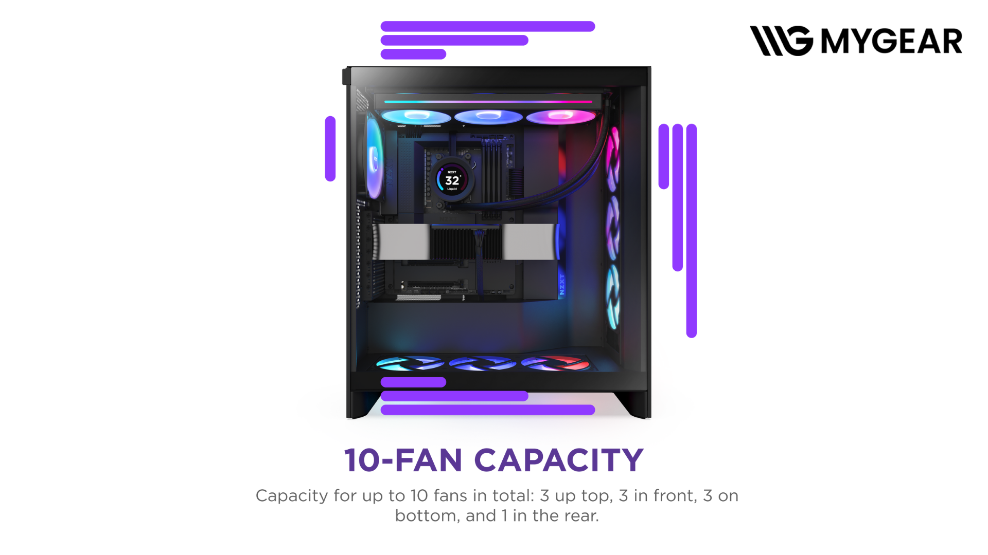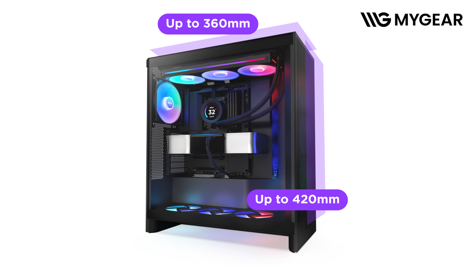 Khoang nội thất rộng, quản lý dây gọn gàng, kết hợp kính cường lực trong suốt và quạt ARGB đi kèm tạo nên hệ thống vừa thẩm mỹ, vừa mạnh mẽ. MYGEAR cung cấp đầy đủ linh kiện như quạt ARGB, tản nhiệt nước, card màn hình, PSU, RAM RGB, giúp bạn build hệ thống đồng bộ, hiệu suất cao và nổi bật.