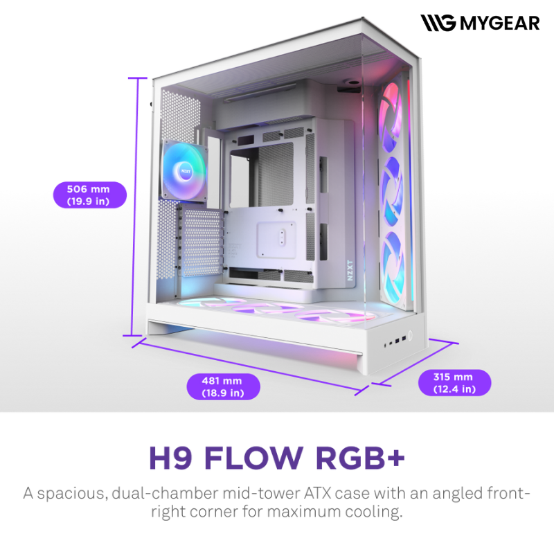 Với kích thước 506 × 315 × 481 mm, vỏ case NZXT H9 Flow RGB Plus White cung cấp đủ không gian cho GPU dài tới 435mm, tản nhiệt CPU cao cấp và nhiều vị trí radiator. Thiết kế giúp lắp card đồ họa mạnh mẽ, PSU chuẩn ATX và linh kiện mở rộng mà không lo hạn chế không gian.