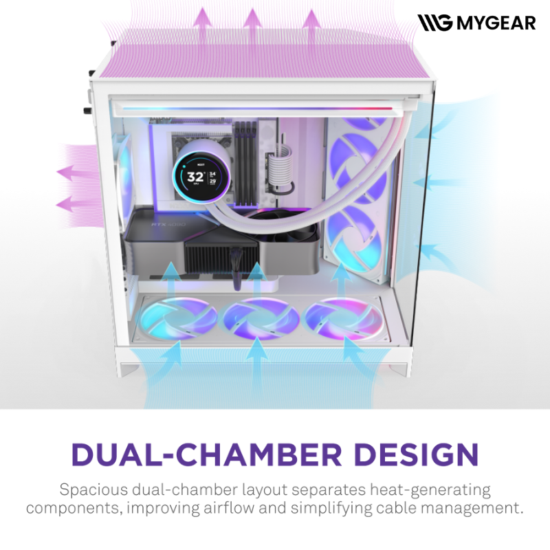 Điểm nhấn của NZXT H9 Flow RGB Plus White là thiết kế Dual-Chamber, tách PSU và khoang dây khỏi khoang mainboard. Thiết kế giúp luồng khí tối ưu, giảm nhiệt toàn hệ thống và nâng cao hiệu năng làm mát, đặc biệt với các build high-end hoặc tản nhiệt nước AIO lớn.