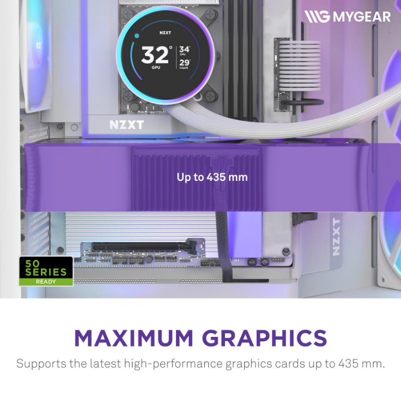 Hỗ trợ chuẩn mainboard ATX, Micro-ATX và Mini-ITX, GPU dài tối đa 435mm, vỏ case NZXT H9 Flow RGB Plus White tương thích hầu hết card đồ họa RTX 50 Series và các GPU cao cấp khác. Case còn hỗ trợ các bộ tản nhiệt nước lớn với radiator phía trên 420mm, trước/phải 420mm, dưới 360mm, sau 120mm, đáp ứng nhu cầu build tản nhiệt nước AIO mạnh mẽ.