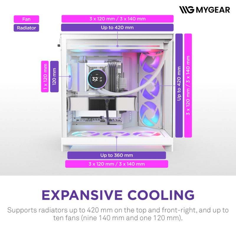 Vỏ máy tính NZXT RGB Plus trắng hỗ trợ tối đa 10 quạt (9×140 mm + 1×120 mm) và nhiều vị trí radiator phía trên/ trước 420mm, dưới 360mm, sau 120mm, giúp luồng gió luôn mát mẻ và ổn định, đáp ứng nhu cầu gaming, render hoặc build máy trạm hiệu suất cao.