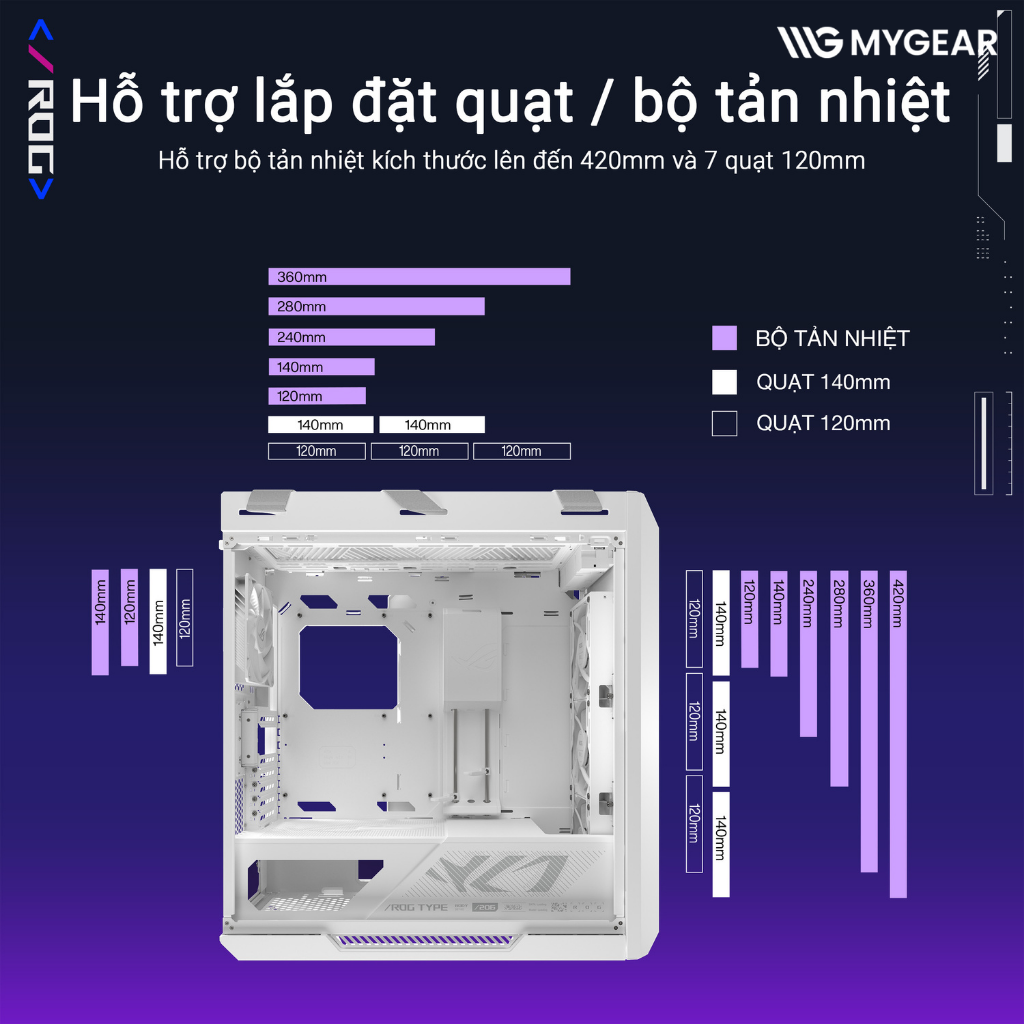 | Hỗ trợ Quạt | Trước: 3x140/120mm; Trên: 3x120/2x140mm; Sau: 1x140/120mm |