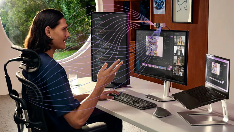 Nghiêng webcam xuống và chia sẻ ghi chú cũng như bản phác thảo trên bàn làm việc với Chế độ Hiển thị (Show Mode), trong khi đang gọi điện, để hợp tác tốt hơn.